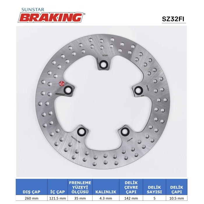 BRAKING markasının SUZUKI AN 400 ve AN 650 Burgman modelleri için tasarlanmış yuvarlak ön fren diski, güvenlik ve performans odaklıdır. Yüksek kalite malzeme kullanımı ve hassas işçilikle üretilmiş olup, montajı ergonomik ve pratik bir şekilde gerçekleştirilir. Delme veya ek işlemler gerektirmeden plug&play uyum sağlar, bu da kurulum sürecini hızlandırır ve kullanım sırasında sorunsuzluk sunar. Diskin yapısı, uzun dönem dayanıklılık ve yüksek ısıl direncini destekleyecek şekilde tasarlanmıştır, böylece fren performansında istikrar sağlar. Modern tasarımı ve kaliteli materyaliyle, güvenliğiniz ve sürüş konforunuz ön plandadır.