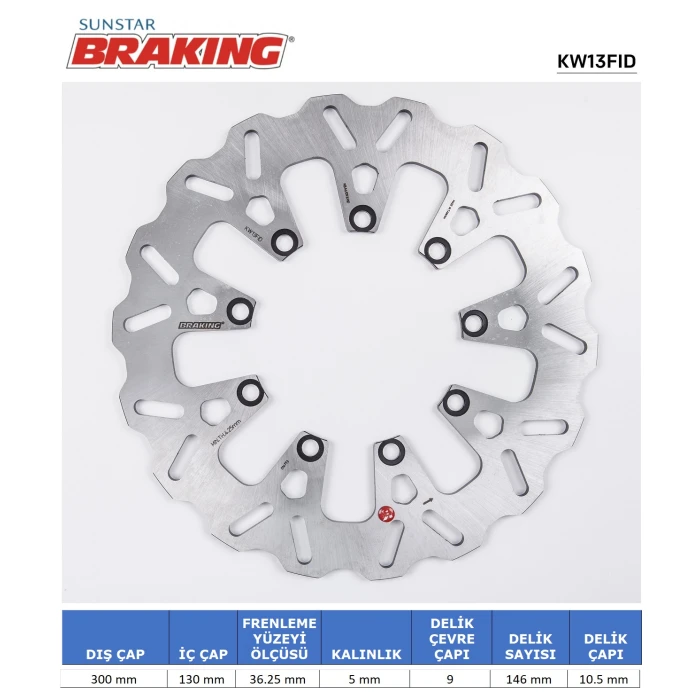 KAWASAKI KLE 500 modelleri için özel olarak tasarlanmış olan BRAKING dalgali ön fren diski, yüksek kalite malzeme kullanımı ve işçilikle üretilmiştir. Diske, dayanıklılığı artırmak ve ısı dağılımını optimize etmek amacıyla dalgalı yapısal tasarım uygulanmıştır. Bu tasarım, fren performansını stabil tutarken aşınma ve ısınma etkilerini azaltmaya yardımcı olur. Ürün, montaj sırasında herhangi bir delme veya ek işlem gerektirmeden, birebir uyumlu olacak şekilde tasarlanmış olup, plug & play montaj sağlar. Bu sayede kısa sürede güvenle kullanımınıza hazır hale gelir. Yüksek dayanım ve güvenlik odaklı yapısı ile fren sistemi üzerinde stabilite ve güvenilirlik sunar. Ayrıca, ürünün dayanıklı malzeme seçimleri ve detaylı işçilik süreçleri, uzun ömürlü kullanım ve yoğun trafik koşullarında performans garantisi sağlar.