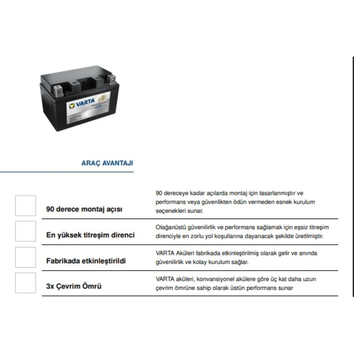 Varta TTZ10S-BS 12V 9Ah Bakımsız AGM motosiklet aküsü, yüksek güvenlik standartlarına uygun olarak tasarlanmış ve dayanıklılığı ile öne çıkan bir enerji kaynağıdır. AGM (Absorbed Glass Mat) teknoloji kullanılarak üretilmiş olup, sıvı elektrolit yerine cam elyaf matlar içerisinde tutularak sızdırmazlık ve titreşim direnci sağlanmıştır. Bu özellikler sayesinde, akü yüksek titreşimlere ve sarsıntılara karşı dayanıklıdır, böylece uzun vadeli güvenilirlik sunar. Akü, delme gerektirmeden plug&play montaj sistemiyle kolayca takılabilir ve çeşitli motosiklet modellerine birebir uyum sağlar.