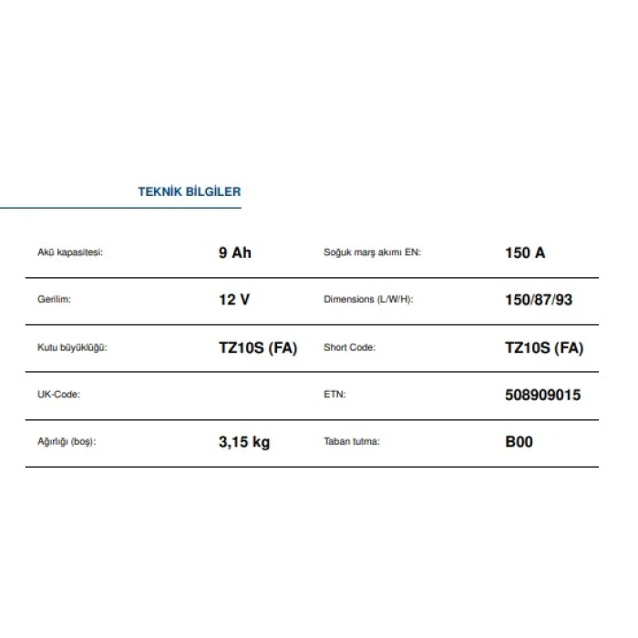 Varta Ttz10S-Bs 12V9Ah Bakımsız Agm (Fa) Motosiklet Aküsü